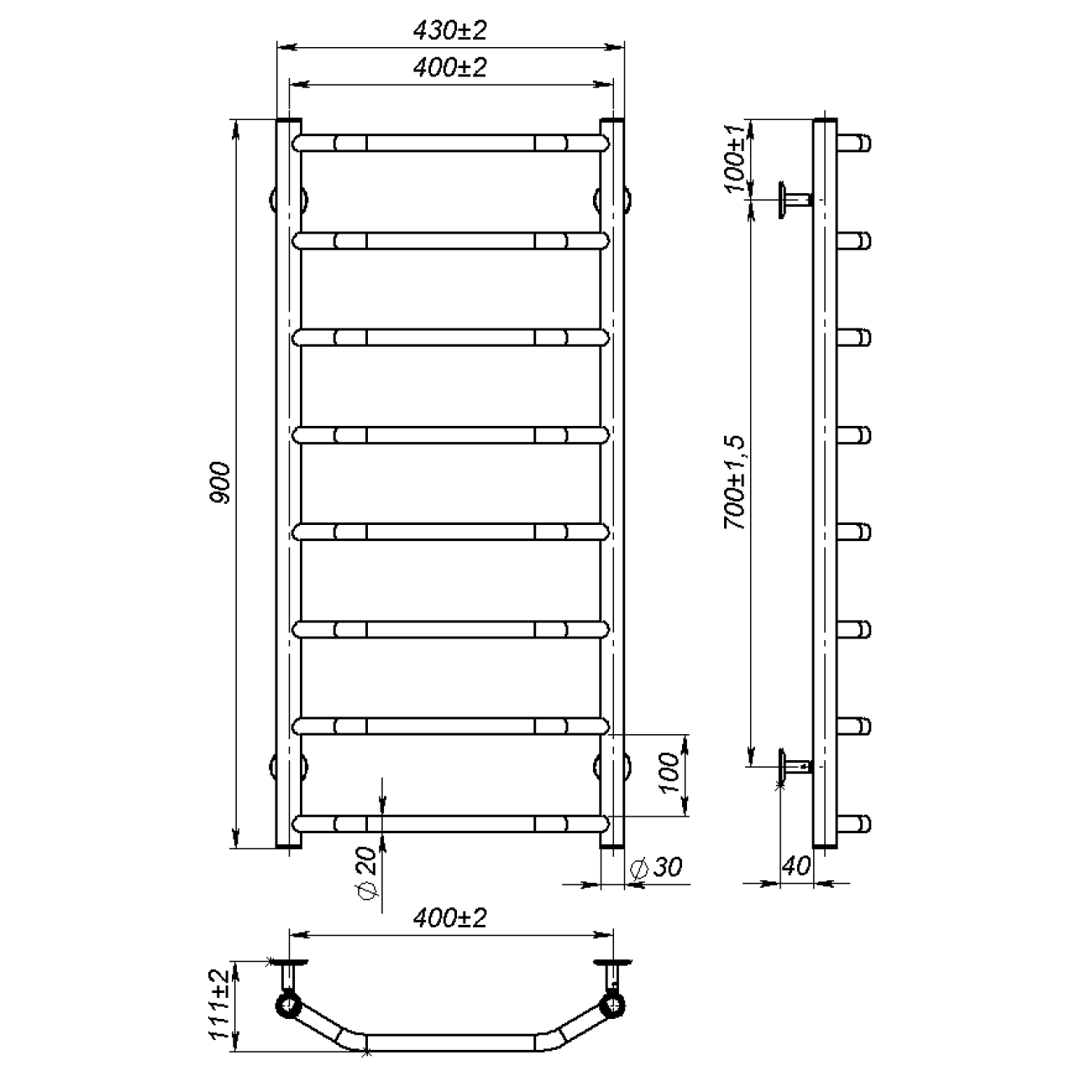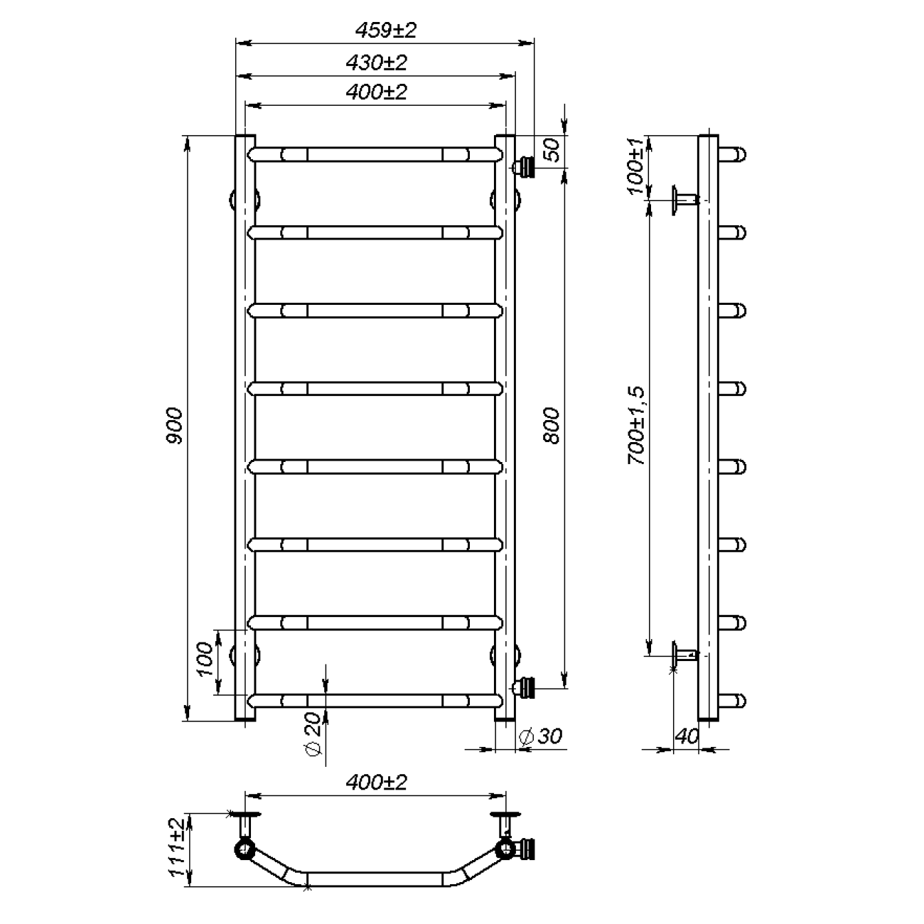 Основні характеристики Рушникосушарка водяна Ava (900*400,8,Сіра,Нижнє підключення)