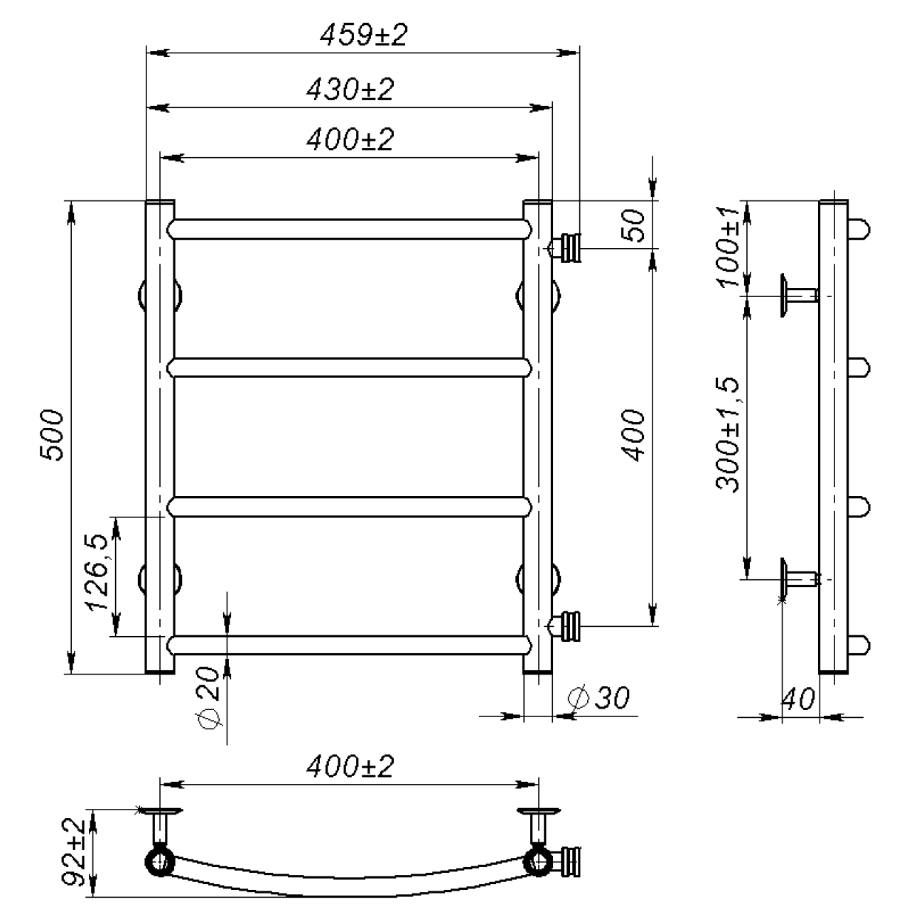 Основні характеристики Рушникосушарка водяна Sora (500*400,4,Чорна,Нижнє підключення)