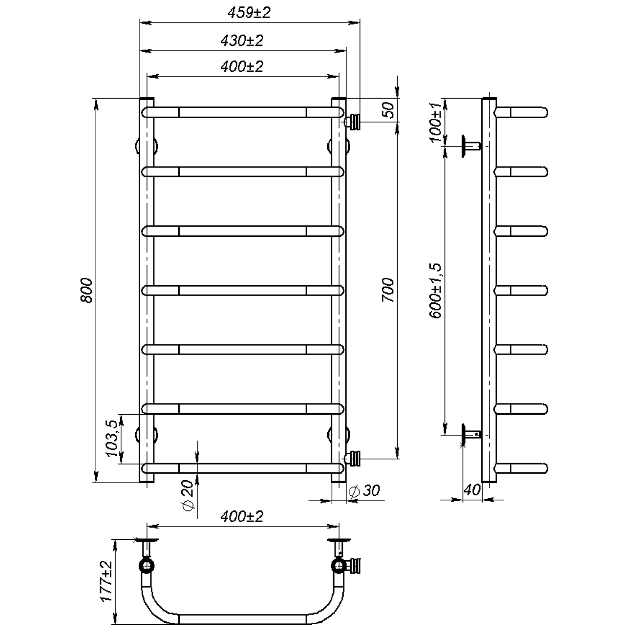 Основні характеристики Рушникосушарка водяна Sunny (800*400,7,Чорна,Ліве підключення)